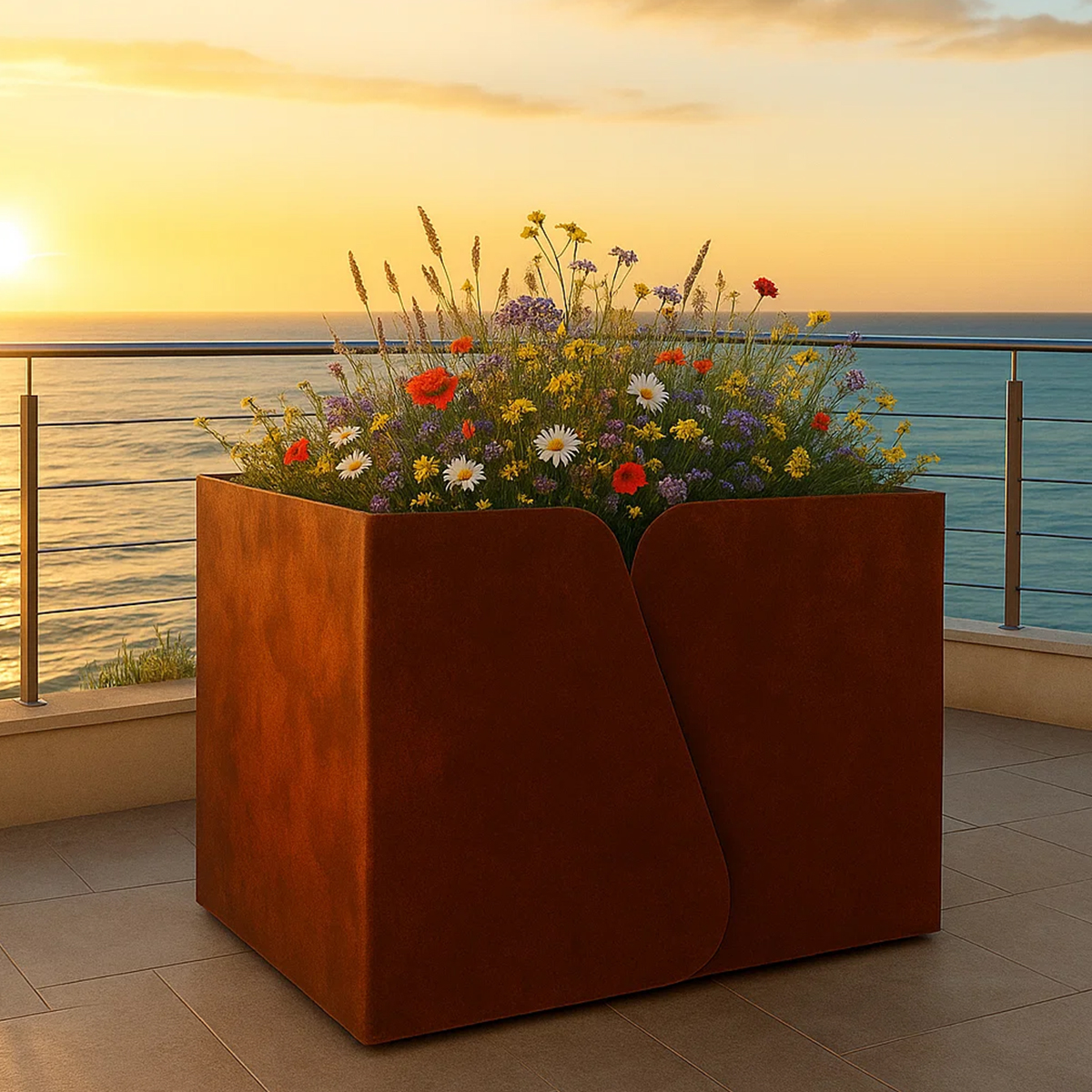 Fioriera a pianta rettangolare realizzata in metallo con trattamento di verniciatura a polveri elettrostatiche effetto corten.