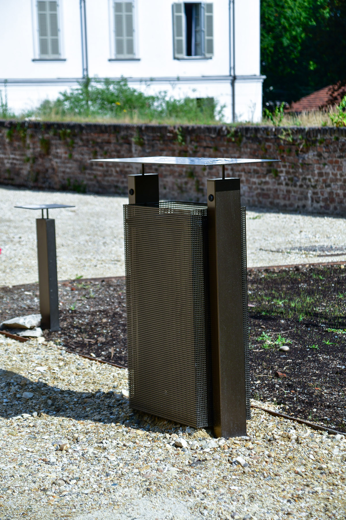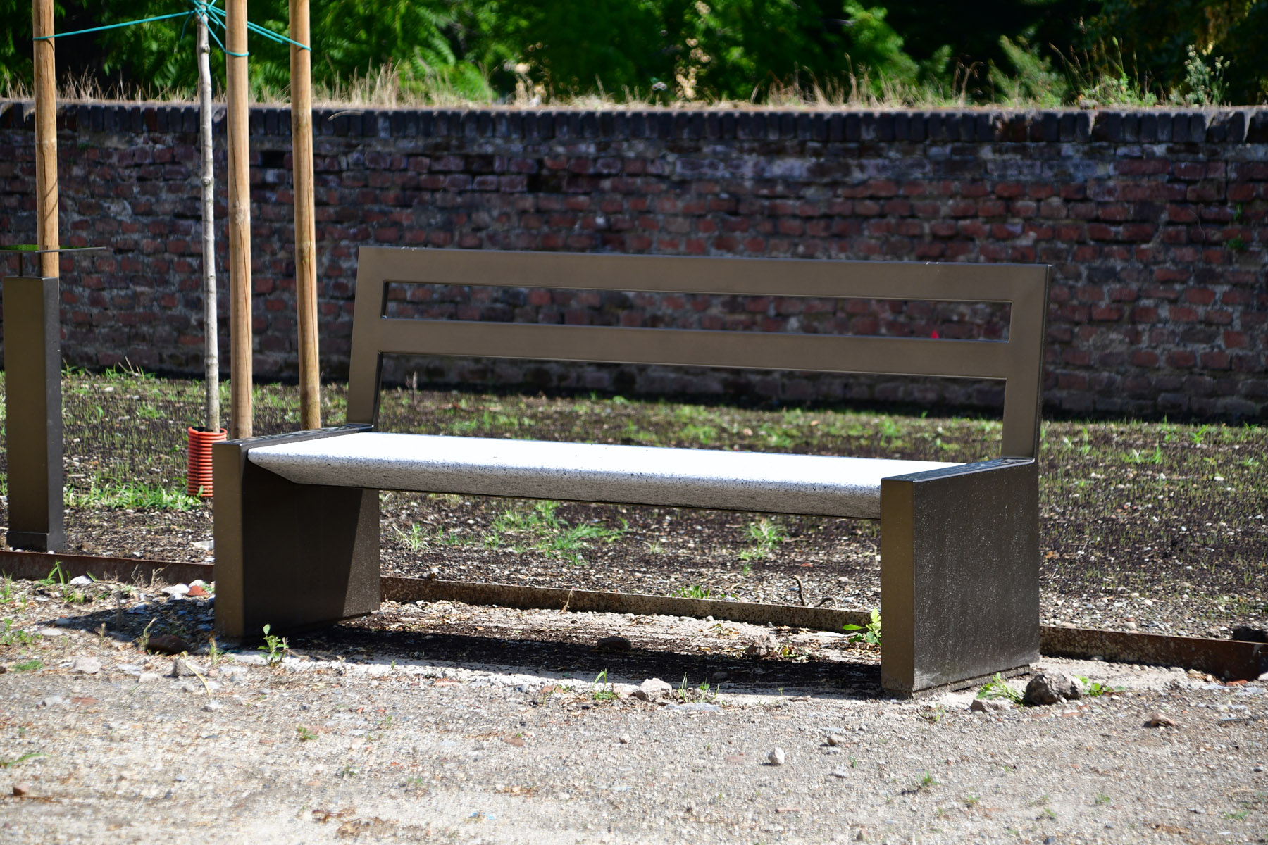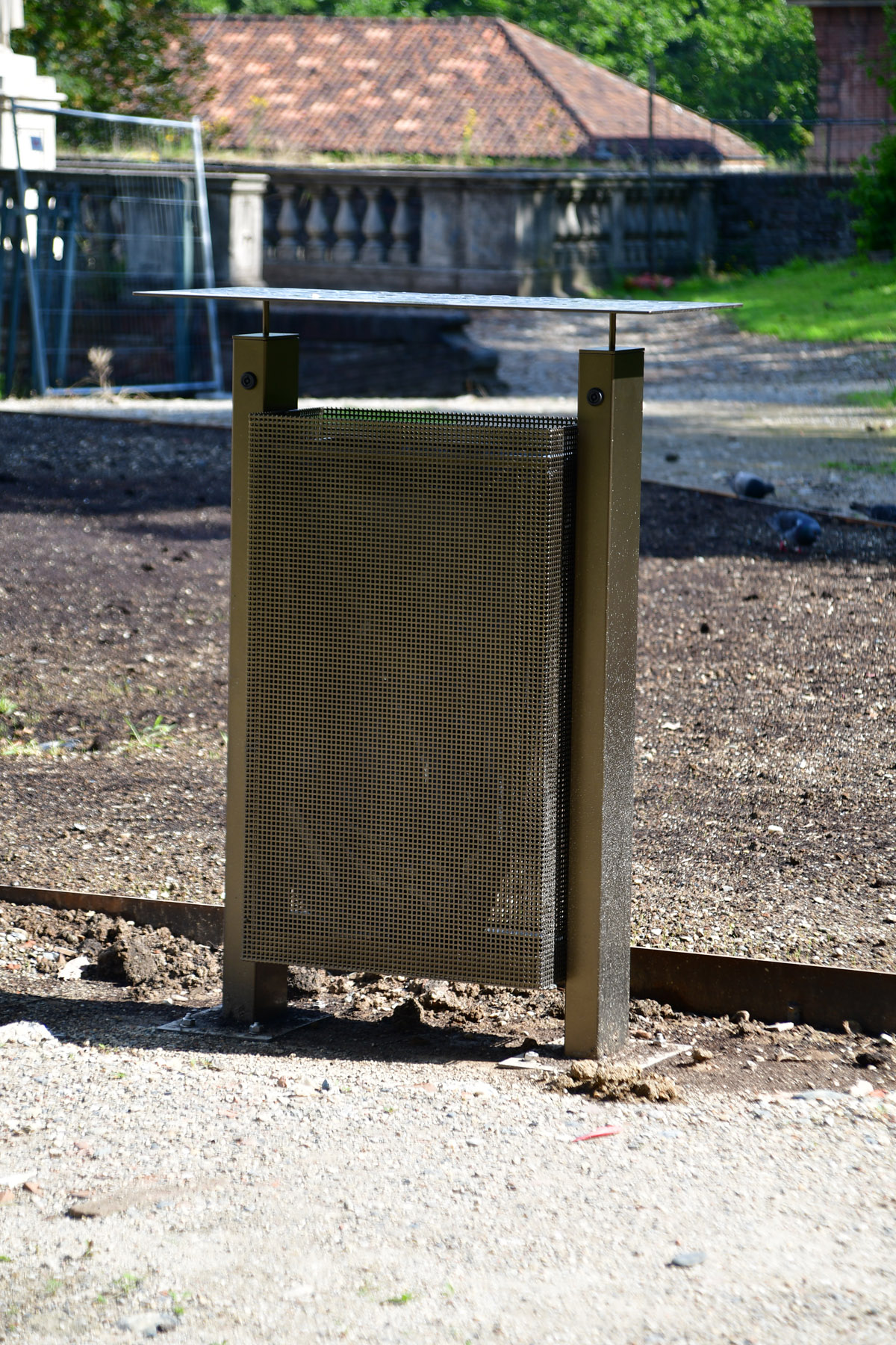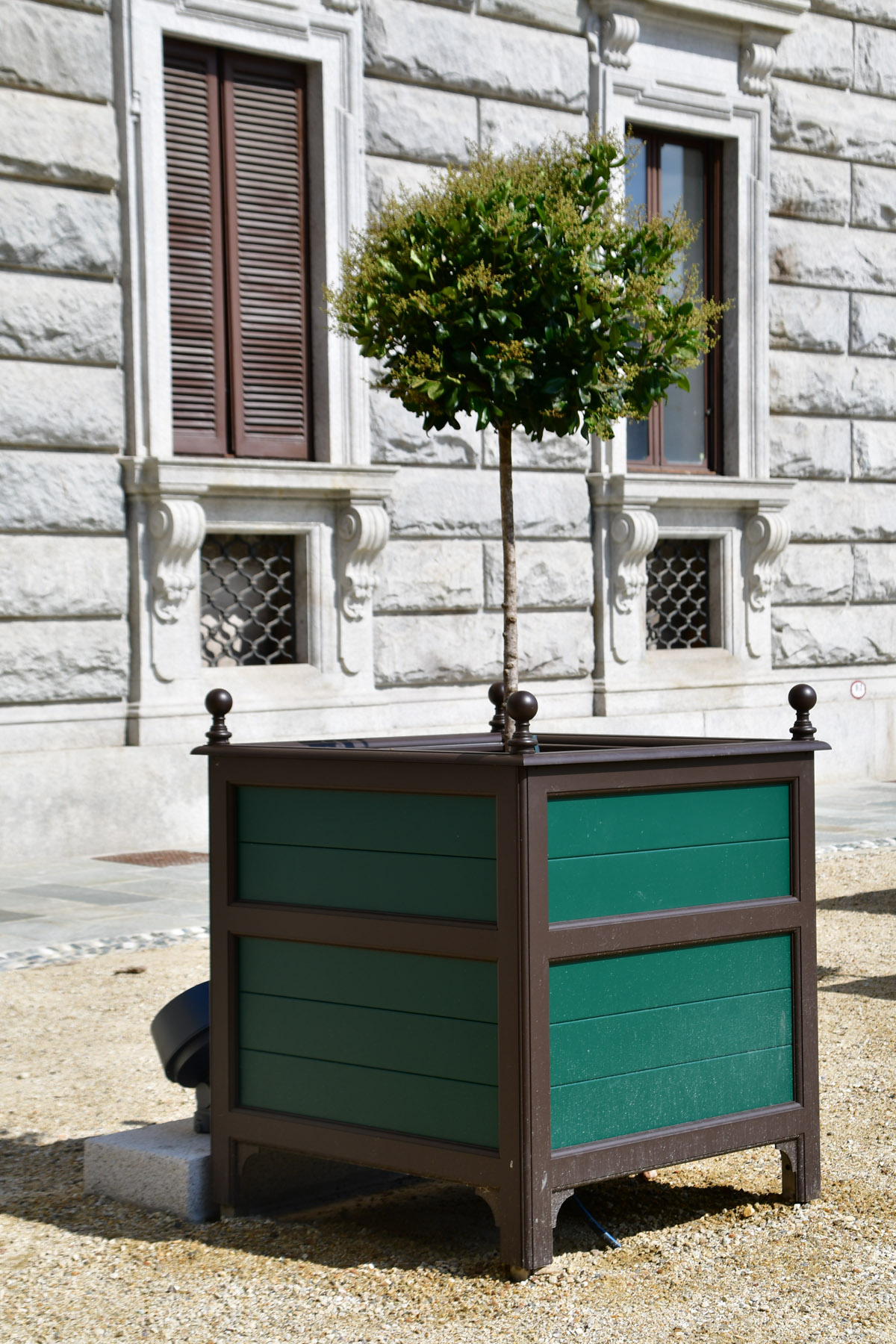 Le fioriere, realizzate con profili in alluminio estrusi, offrono leggerezza e resistenza alla corrosione, mentre la verniciatura a polvere garantisce una finitura uniforme e duratura. I cestini portarifiuti, in acciaio inox con rete microforata e serratura incorporata, assicurano igiene e sicurezza, impedendo la fuoriuscita di piccoli rifiuti. Le panchine, con struttura in acciaio e seduta in pietra, combinano robustezza e naturalità, integrandosi perfettamente con l’ambiente del giardino.