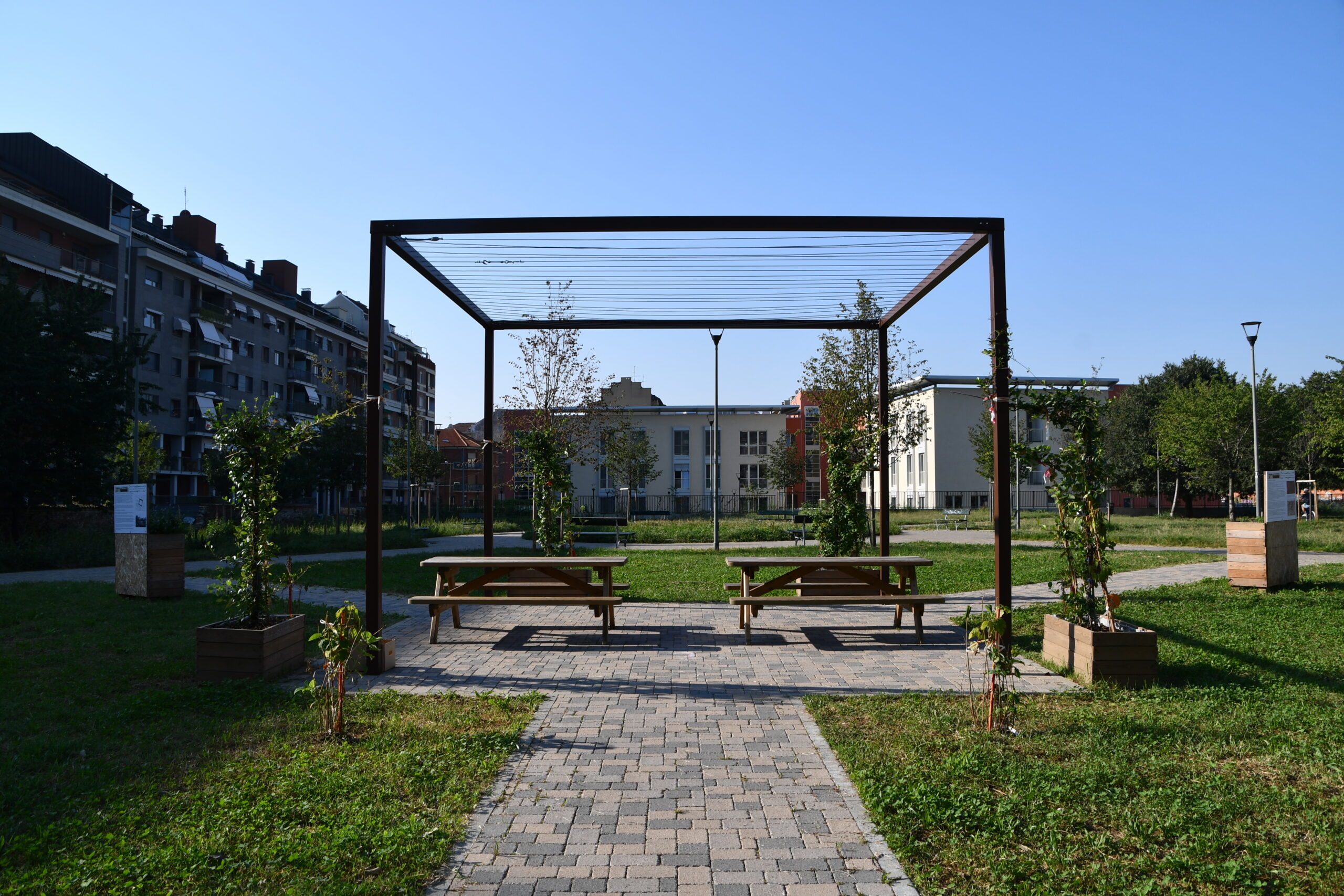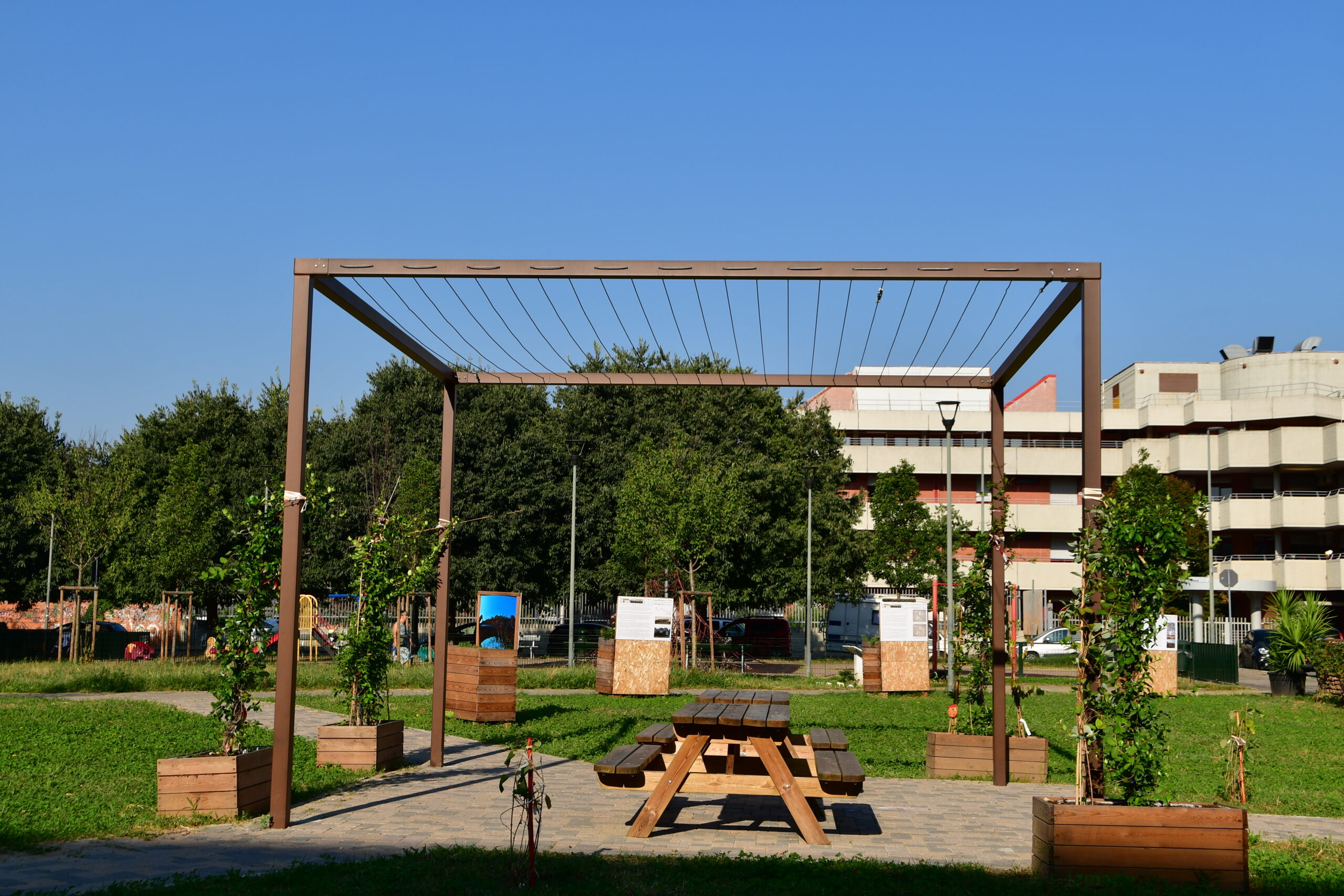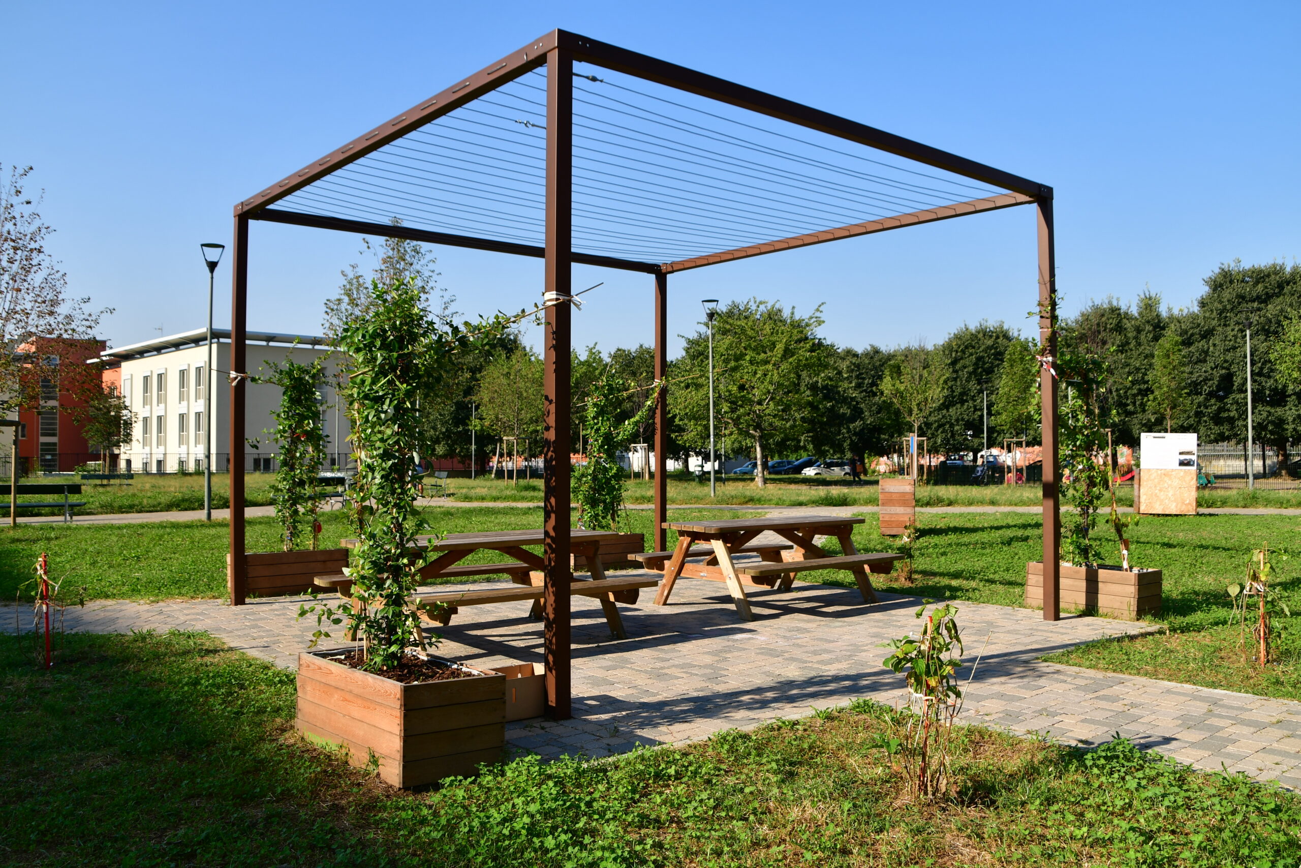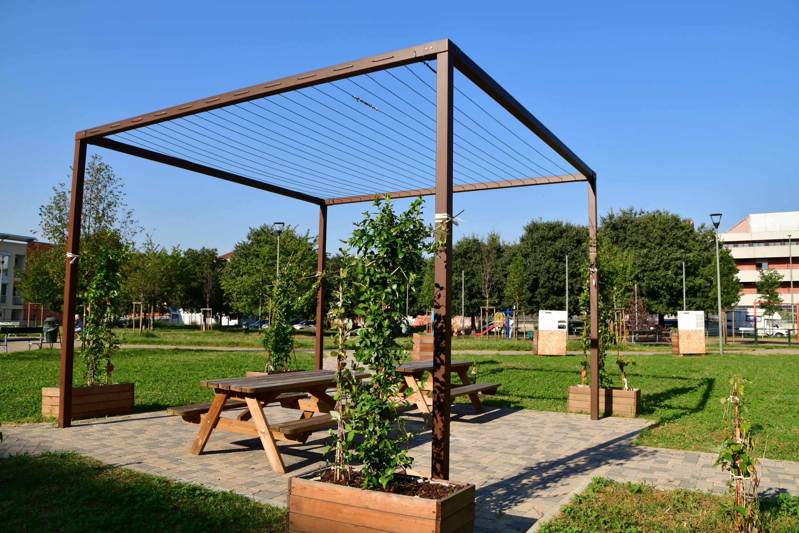 Le funi tesate, realizzate in acciaio inossidabile, vengono fissate alla struttura metallica tramite appositi tenditori. La disposizione delle funi è studiata per creare una rete di supporto che favorisca l’arrampicamento delle piante, creando un effetto di verde verticale.