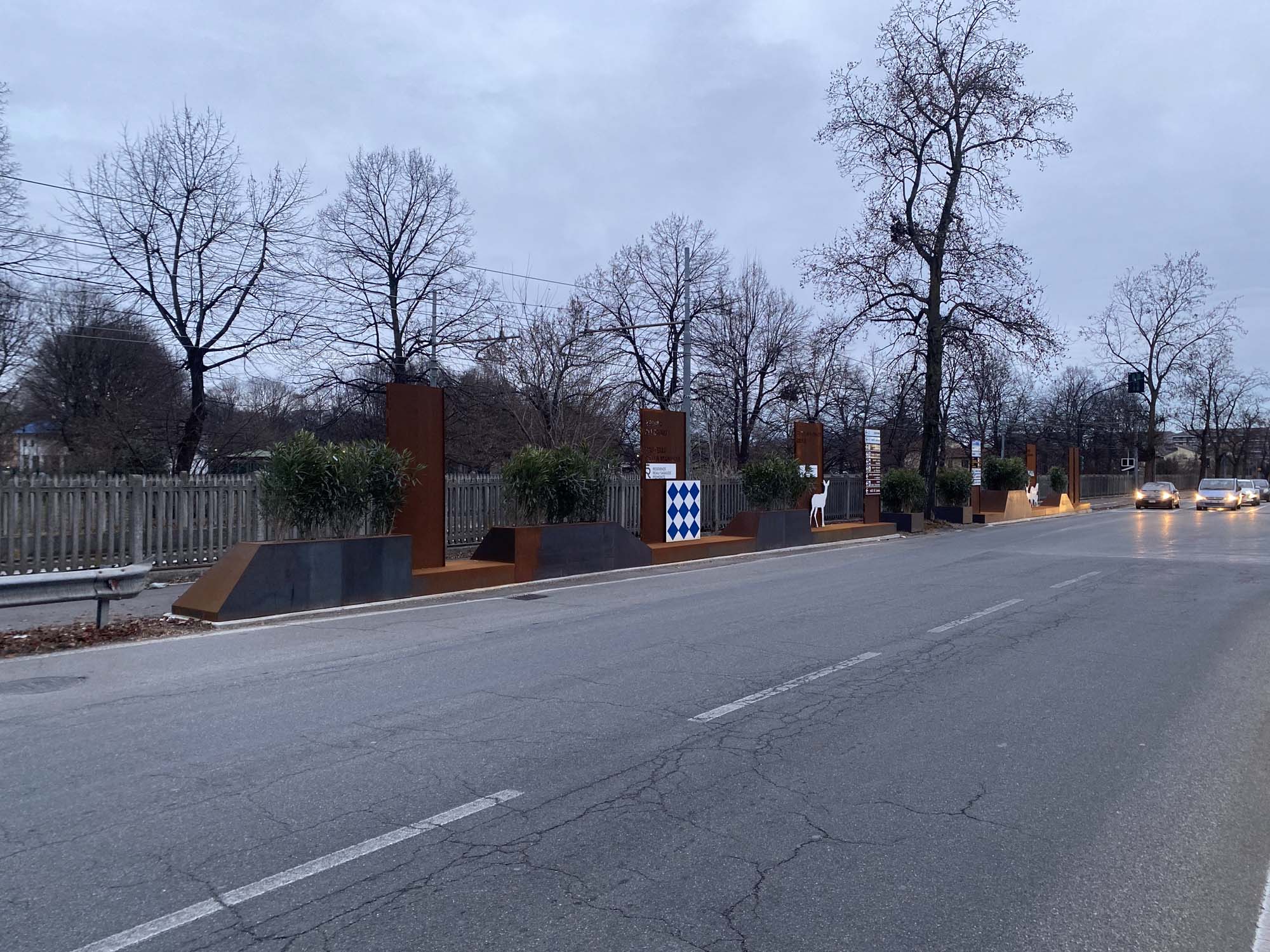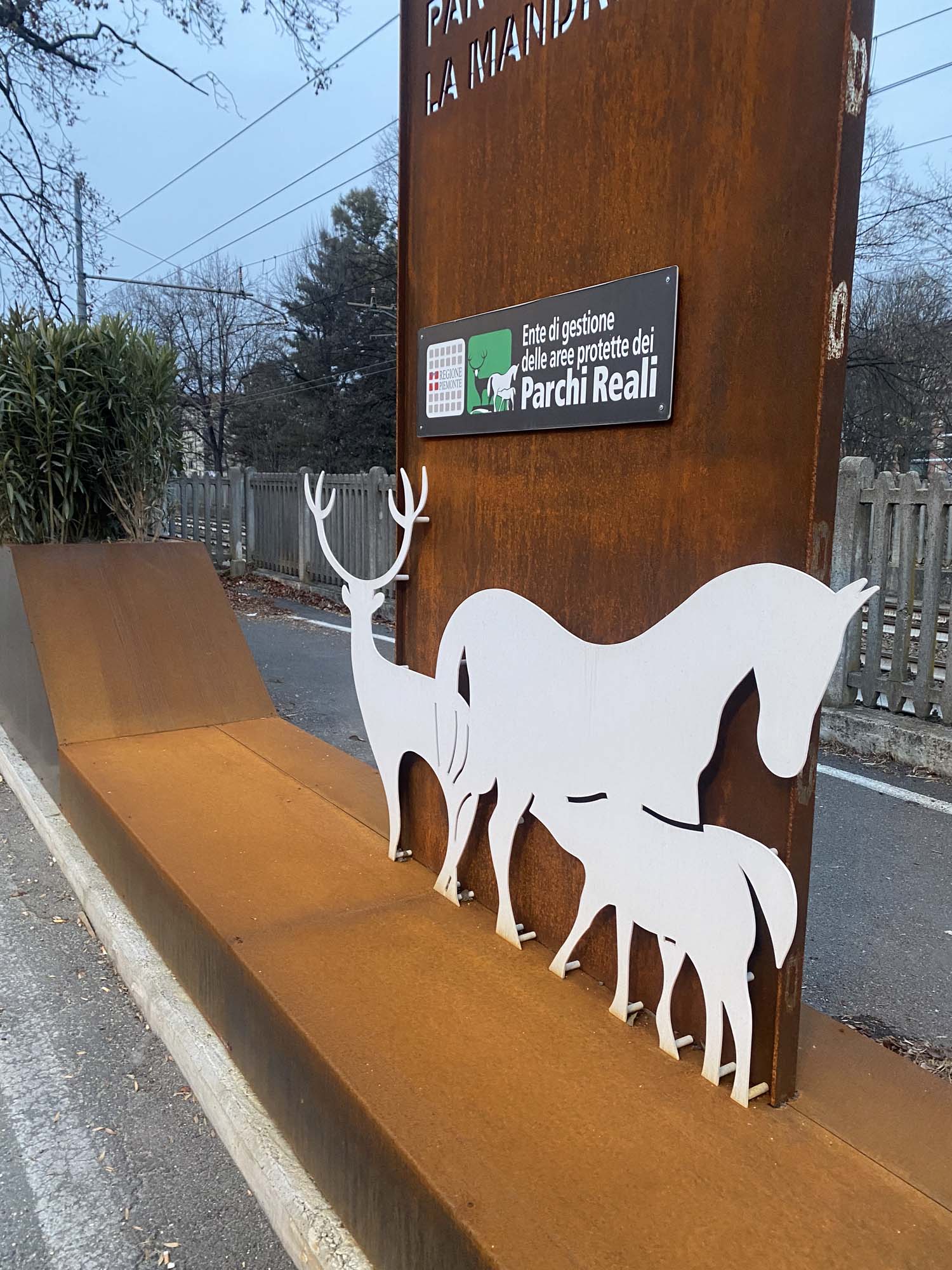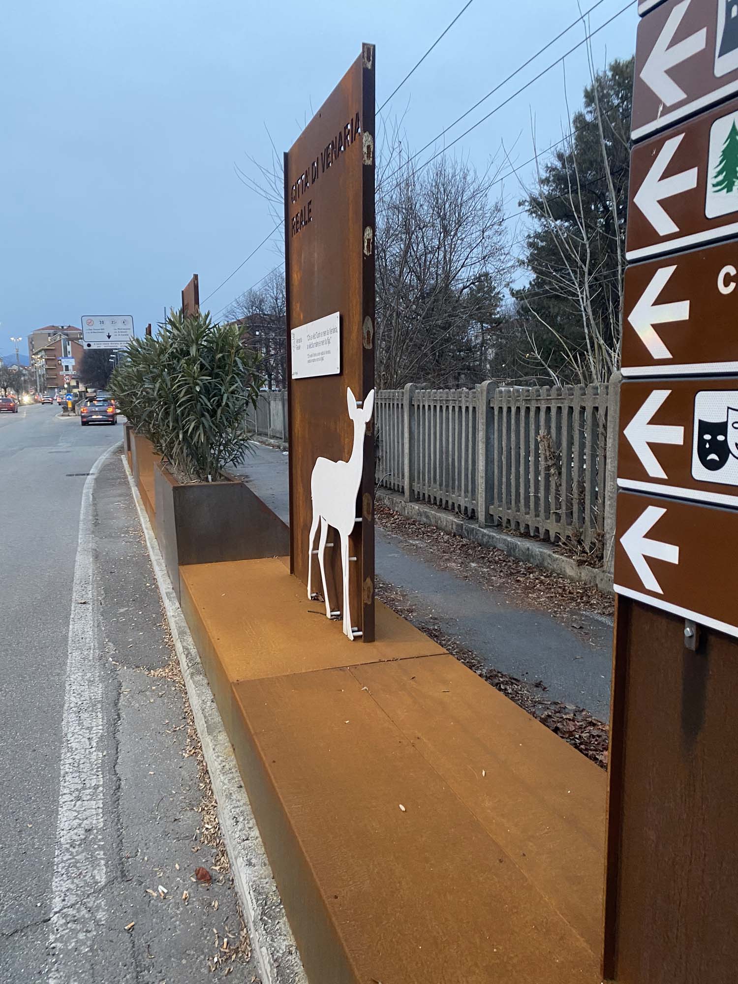 L’installazione consiste in una quinta decorativa composta da fioriere, pannelli segnaletici in lamiera corten e elementi decorativi come rombi, cervi e cavalli, questi ultimi verniciati con diverse tonalità RAL per un effetto cromatico più vivace. Questa quinta svolge sia una funzione estetica che pratica, con i pannelli segnaletici che forniscono informazioni utili ai visitatori e le fioriere che contribuiscono a integrare ulteriormente la natura nell’ambiente urbano.