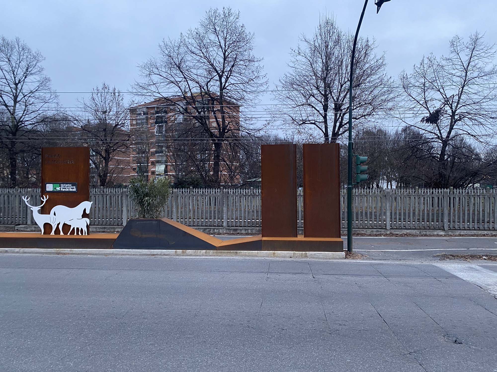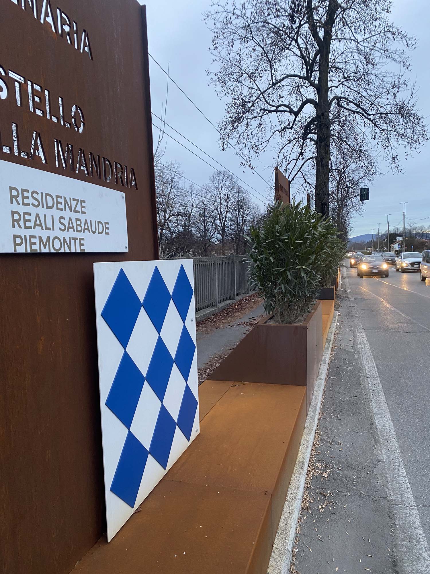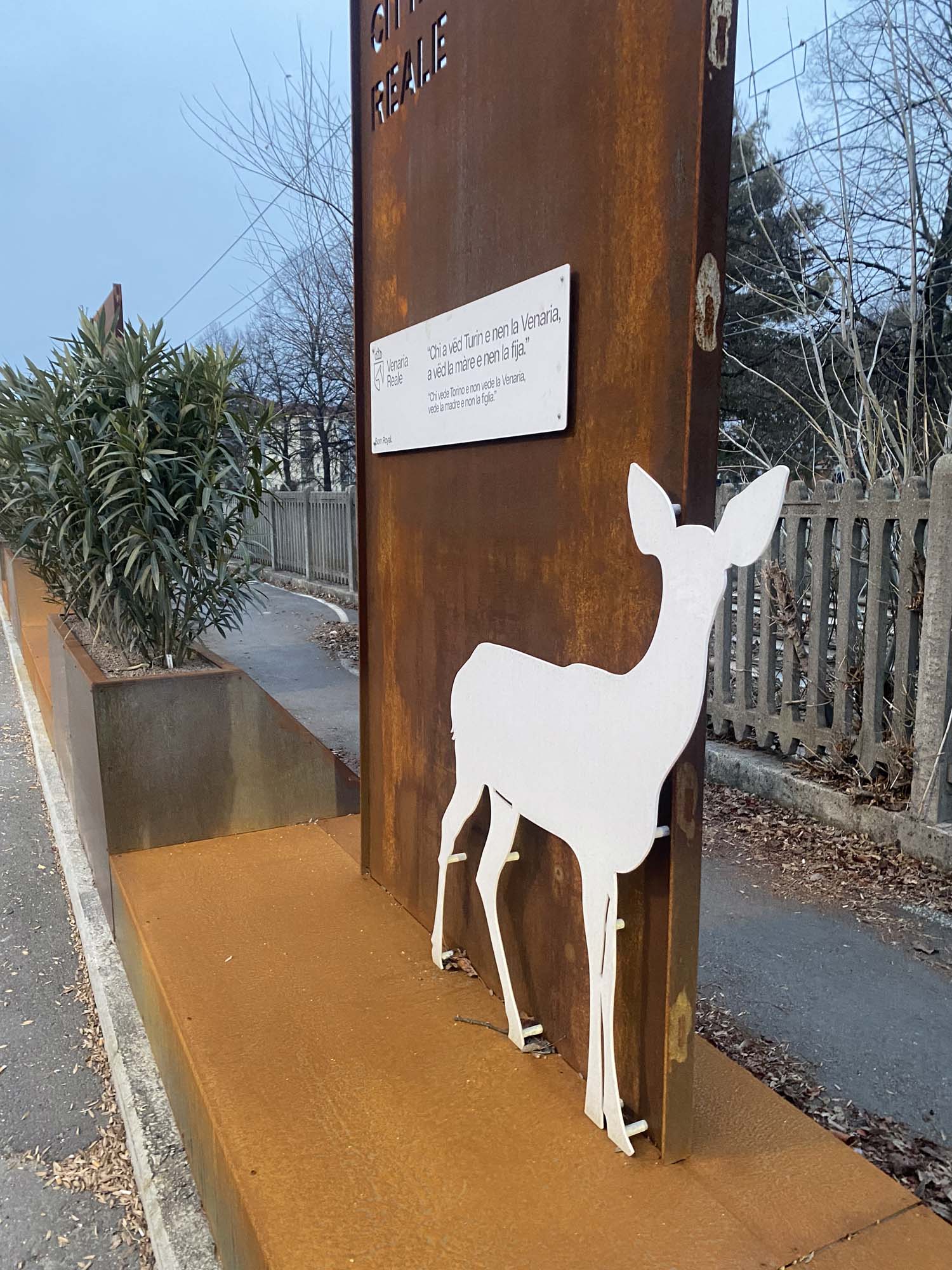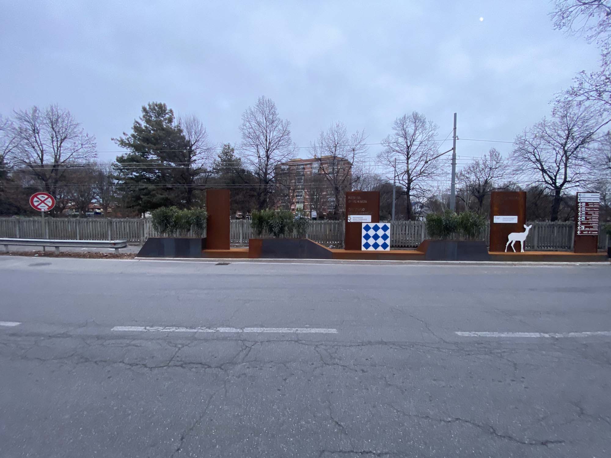 L’installazione consiste in una quinta decorativa composta da fioriere, pannelli segnaletici in lamiera corten e elementi decorativi come rombi, cervi e cavalli, questi ultimi verniciati con diverse tonalità RAL per un effetto cromatico più vivace. Questa quinta svolge sia una funzione estetica che pratica, con i pannelli segnaletici che forniscono informazioni utili ai visitatori e le fioriere che contribuiscono a integrare ulteriormente la natura nell’ambiente urbano.