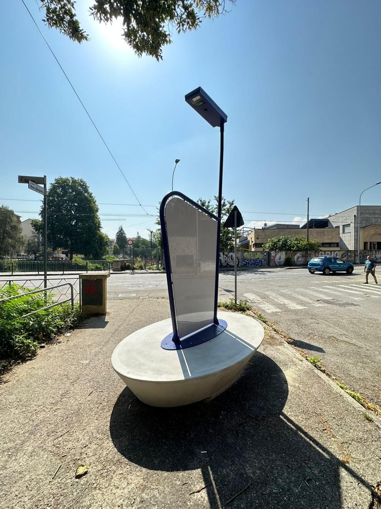 La struttura è ancorata a una piastra metallica, a sua volta saldamente fissata su un blocco di cemento, per assicurare stabilità e resistenza nel tempo. L’intera realizzazione si distingue per l’uso di materiali di alta qualità e per un design che si integra armoniosamente nel contesto urbano, offrendo al contempo un servizio utile alla comunità.